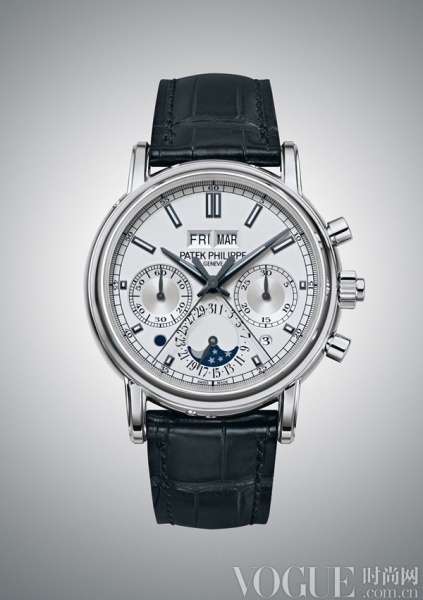 此款超级复杂腕表是采用原厂制造机芯的百达翡丽“经典”计时表系列的完美收官之作。这款极具现代感的腕表汇集了内行腕表鉴赏者称道的各种制造特色■★◆◆◆,包括基于 6 项专利的双秒追针机芯■★。此机芯本身就采用了两项技术创新,外加一块纤薄的万年历模块■◆■。与百达翡丽的其他杰作一样,此款腕表也是以铂金制成:这种珍罕、恒久不变的金属能为腕表提供一直延续到未来的极好保护■★。表壳■◆★■:铂金材质◆■★■,直径 40 毫米,在 6 点钟方位的表耳之间镶嵌一颗钻石,蓝宝石水晶玻璃表盘和底盖,可以换成铂金盖■■。机芯:原厂制造的手动上弦机械机芯◆■◆,两个导柱轮, 65 小时动力储备,带有百达翡丽印记。功能:中置时、分、秒显示和双秒追针◆◆■★■,小秒盘,30分钟瞬时计时码表,万年历显示月份日期■★■、闰年◆◆◆◆◆★,小窗显示昼夜,指针式日期显示◆◆,月相显示★■★◆★◆。表盘:乳白色光泽表盘。表扣■★★◆◆:折叠式铂金表扣◆■★■◆◆。