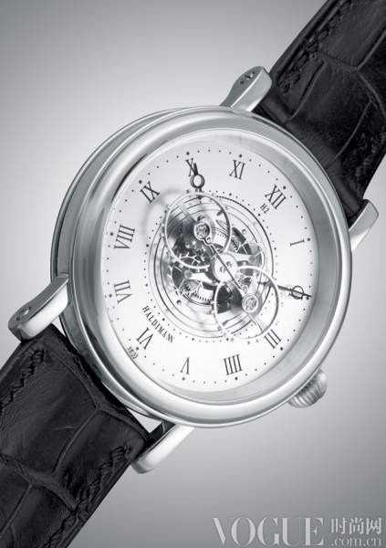 作为一个始于 1642 年的制表家族的继承者,Beat Haldimann 以他非凡的创造力延续了令人惊叹的传奇。在此款腕表中,他创造了一对飞行陀飞轮并亲手将其组装起来。这两个陀飞轮装置是同步的(基于摆轮共振原理)★◆★★◆,它们围绕着表盘的中心轴旋转 360◆◆。此款腕表的非凡特质决定了用于制造其手工表壳材质的不二之选:铂金。表壳:手工制造的铂金表壳◆◆■◆★,直径 39 或 42 毫米◆◆■◆★,蓝宝石水晶玻璃表盘和底盖■★◆。机芯◆◆★★:原厂制造的手动上弦机械机芯■◆◆◆◆,配备双飞行陀飞轮★★★■,两个铂金摆轮,两个独立的恒力装置,三个发条盒★◆★■■。功能:时★■、分、秒显示。表扣:折叠式铂金表扣。